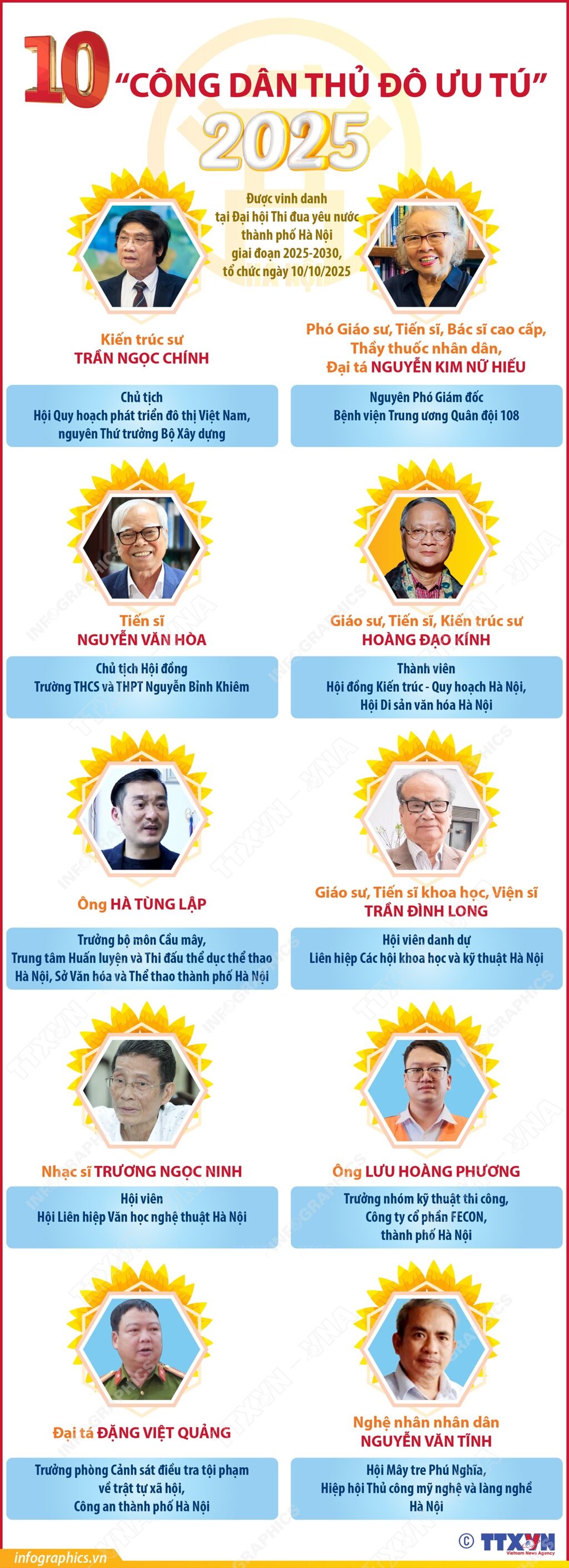 Tại Đại hội Thi đua yêu nước thành phố Hà Nội giai đoạn 2025-2030 diễn ra sáng 10/10/2025 do Thành ủy, HĐND, UBND, Ủy ban Mặt trận Tổ quốc Việt Nam thành phố Hà Nội tổ chức, 10 “Công dân Thủ đô ưu tú” năm 2025 đã được vinh danh. “Công dân Thủ đô ưu tú” là danh hiệu cao quý của thành phố Hà Nội xét tặng những cá nhân có thành tích đặc biệt xuất sắc, tiêu biểu trên các lĩnh vực của đời sống xã hội.