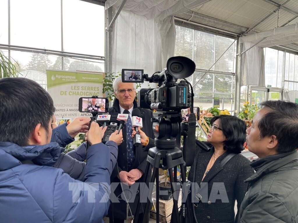 | Các phóng viên thường trú Việt Nam tại Pháp phỏng vấn một lãnh đạo doanh nghiệp Pháp. |
