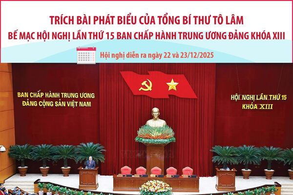 Sau 2 ngày làm việc khẩn trương, sáng 23/12/2025, Hội nghị lần thứ 15 Ban Chấp hành Trung ương Đảng khóa XIII đã hoàn thành toàn bộ nội dung, chương trình đề ra với sự đoàn kết, thống nhất cao, chất lượng tốt. Ban Chấp hành Trung ương xác định trong giai đoạn cách mạng mới, chúng ta cần tập trung thực hiện 3 đột phá chiến lược. Đồng thời nỗ lực thực hiện những nhiệm vụ chủ yếu với 6 trọng tâm.