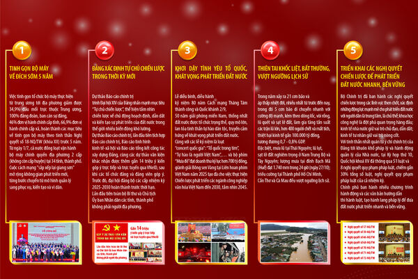 Tinh gọn bộ máy về đích sớm 5 năm; Đảng xác định tự chủ chiến lược trong thời kỳ mới; Lễ diễu binh, diễu hành kỷ niệm 80 năm Cách mạng Tháng Tám thành công và Quốc khánh 2/9, 50 năm giải phóng miền Nam, thống nhất đất nước; Thiên tai khốc liệt, bất thường, vượt ngưỡng lịch sử, Triển khai các nghị quyết chiến lược để phát triển đất nước nhanh, bền vững; Tăng trưởng kinh tế Việt Nam nằm trong nhóm dẫn đầu châu Á; Công ước Hà Nội - Khuôn khổ pháp lý toàn cầu đầu tiên về chống tội phạm mạng; Hoàn thành trước thời hạn mục tiêu xóa nhà tạm, nhà dột nát trên cả nước; Hoàn thành hơn 3.500 km đường bộ cao tốc và 100 năm Báo chí Cách mạng Việt Nam là 10 sự kiện nổi bật của Việt Nam năm 2025 do TTXVN bình chọn.