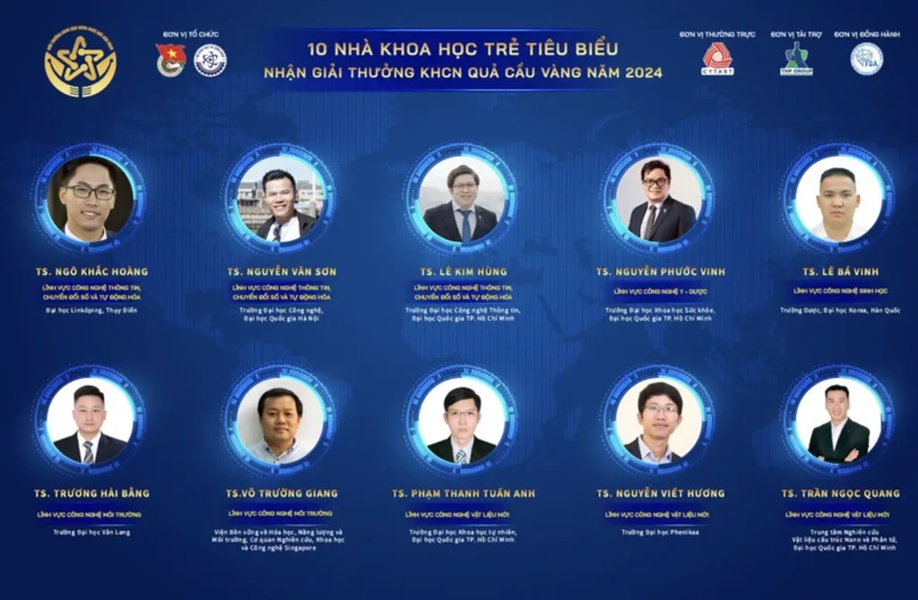 Trung ương Đoàn Thanh niên cộng sản Hồ Chí Minh vừa công bố danh sách 10 nhà khoa học trẻ xuất sắc nhận Giải thưởng Khoa học công nghệ Quả Cầu Vàng năm 2024. Đây đều là các nhà khoa học có bằng sáng chế, giải pháp hữu ích, có nhiều công bố quốc tế chất lượng cao, nhiều giải thưởng trong nước và quốc tế. Đáng chú ý, 10 chủ nhân Quả Cầu Vàng năm nay đều có trình độ tiến sĩ, trong đó 3 tiến sĩ đang làm việc ở nước ngoài.