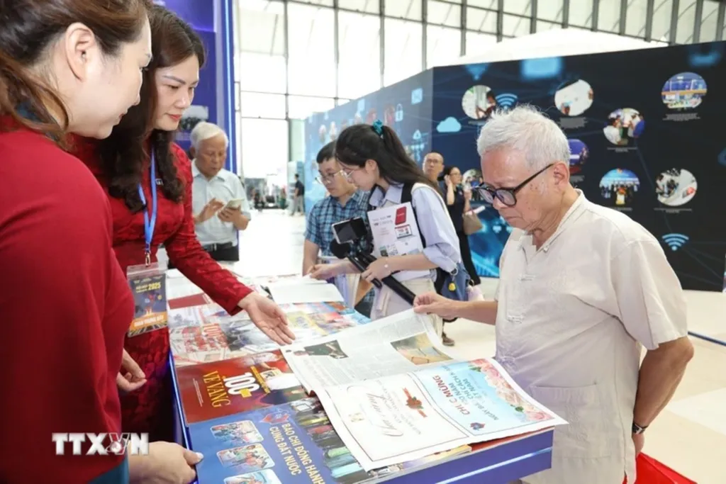 | Đại biểu tham quan gian trưng bày ấn phẩm của Thông tấn xã Việt Nam tại Hội báo toàn quốc năm 2025. (Ảnh: Lê Đông/TTXVN) |