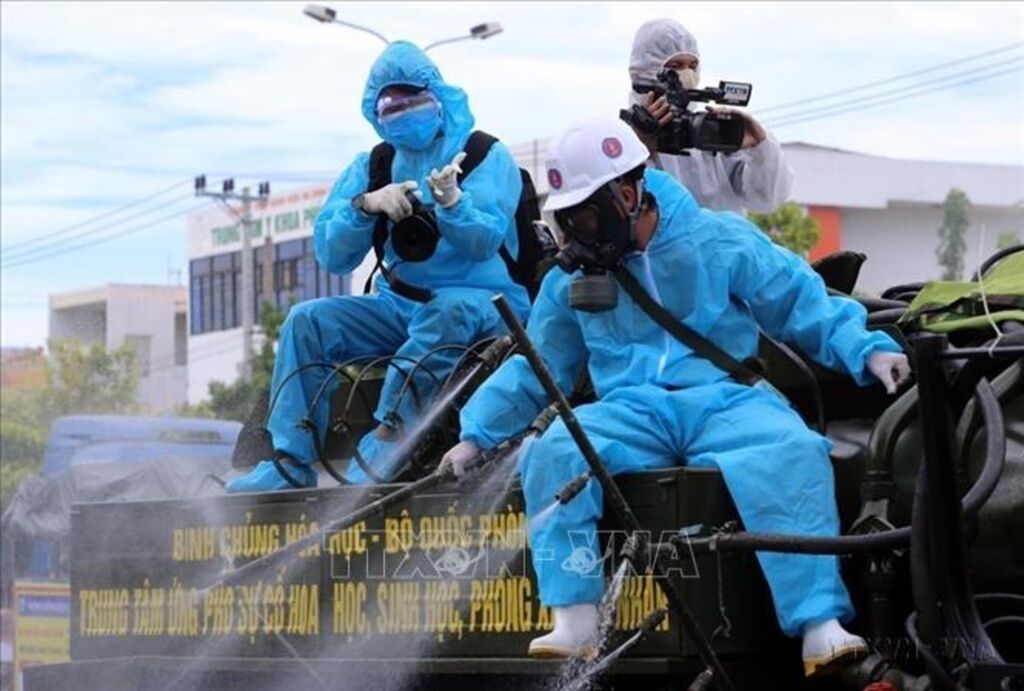 | Phóng viên TTXVN tại Đà Nẵng tác nghiệp trên thùng xe phun thuốc khử trùng các khu vực có nguy cơ lây nhiễm COVID-19 cao trên địa bàn quận Sơn Trà (thành phố Đà Nẵng). |