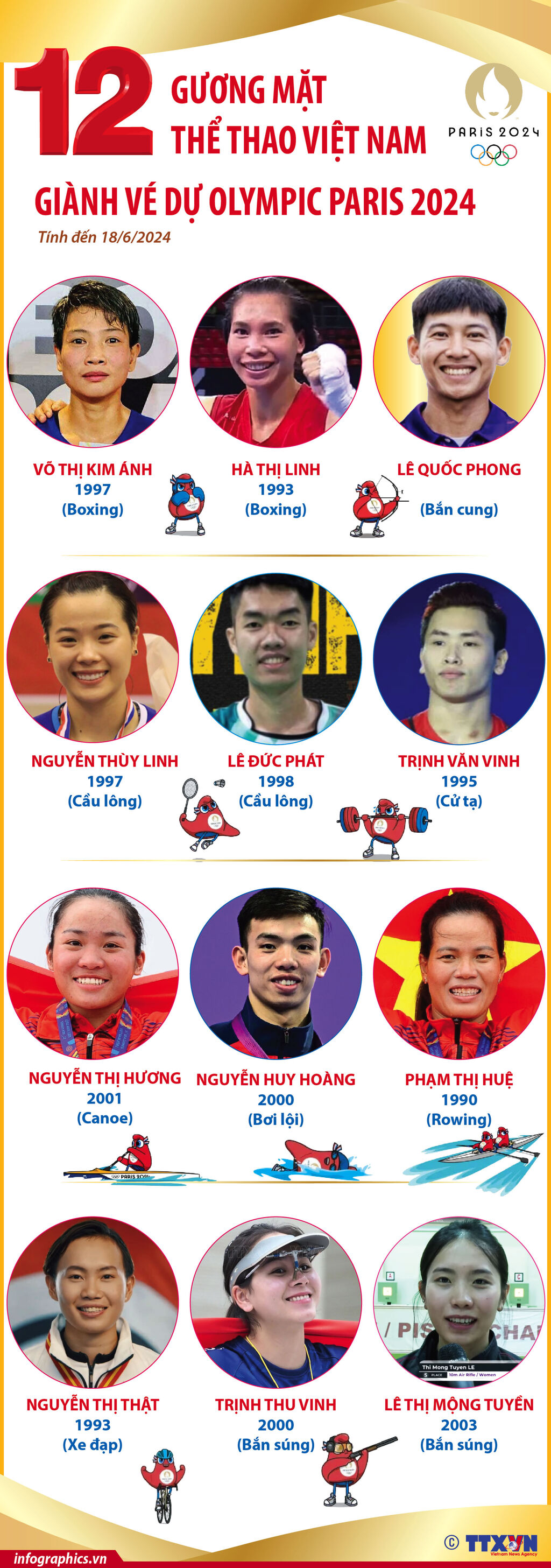 Đó là các vận động viên: Nguyễn Thị Thật (xe đạp), Nguyễn Huy Hoàng (bơi lội), Trịnh Thu Vinh và Lê Thị Mộng Tuyền (bắn súng), Trịnh Văn Vinh (cử tạ), Nguyễn Thị Hương (canoe), Phạm Thị Huệ (Rowing) Nguyễn Thùy Linh và Lê Đức Phát (cầu lông); Võ Thị Kim Ánh và Hà Thị Linh (boxing); Lê Quốc Phong (bắn cung).