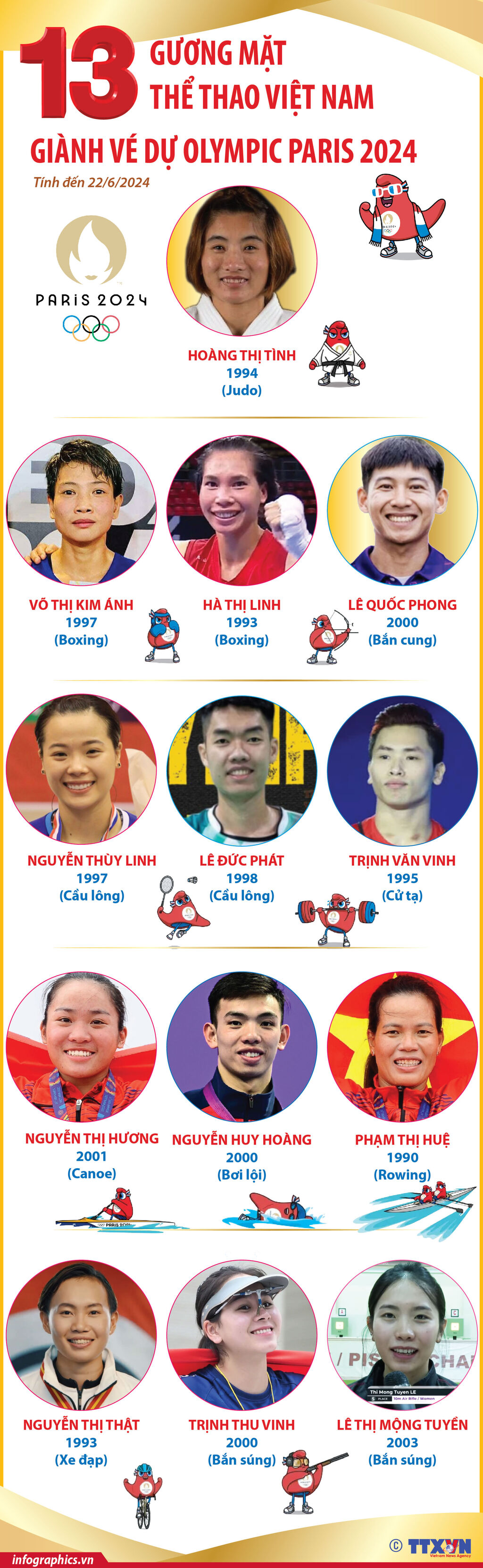 Hà Nội (TTXVN 22/6) Tính đến ngày 22/6/2024, thể thao Việt Nam có 13 vé chính thức tham dự Olympic Paris 2024. Đó là các vận động viên: Nguyễn Thị Thật (xe đạp), Nguyễn Huy Hoàng (bơi lội), Trịnh Thu Vinh và Lê Thị Mộng Tuyền (bắn súng), Trịnh Văn Vinh (cử tạ), Nguyễn Thị Hương (canoe), Phạm Thị Huệ (rowing) Nguyễn Thùy Linh và Lê Đức Phát (cầu lông); Võ Thị Kim Ánh và Hà Thị Linh (boxing); Lê Quốc Phong (bắn cung); Hoàng Thị Tình (judo).