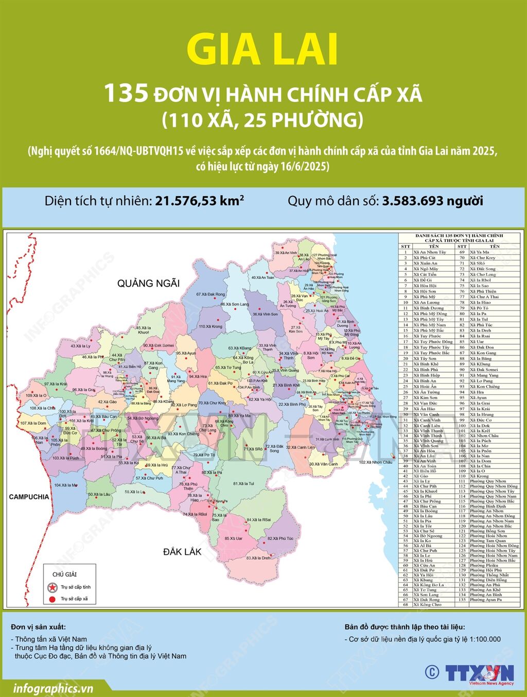 135 đơn vị hành chính cấp xã của tỉnh Gia Lai năm 2025