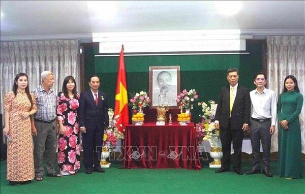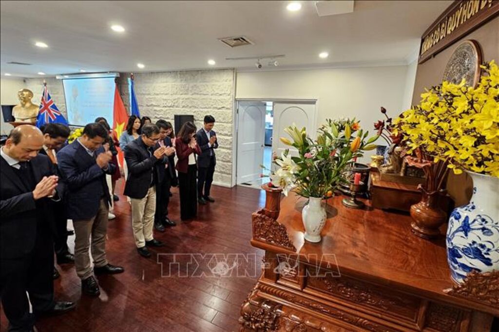 | Đại sứ Phạm Hùng Tâm và các đại biểu dâng hương tưởng nhớ Chủ tịch Hồ Chí Minh tại Bàn thờ Bác Hồ trong trụ sở Đại sứ quán Australia ở thủ đô Canberra. Ảnh: TTXVN phát |