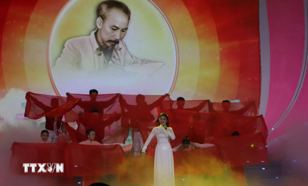 | Một tiết mục trong Chương trình nghệ thuật “Người là niềm tin tất thắng,” diễn ra tại Khu di tích lịch sử Đền thờ Bác Hồ ở tỉnh Hậu Giang, tối 18/5/2025). (Ảnh: Hồng Thái/TTXVN) |