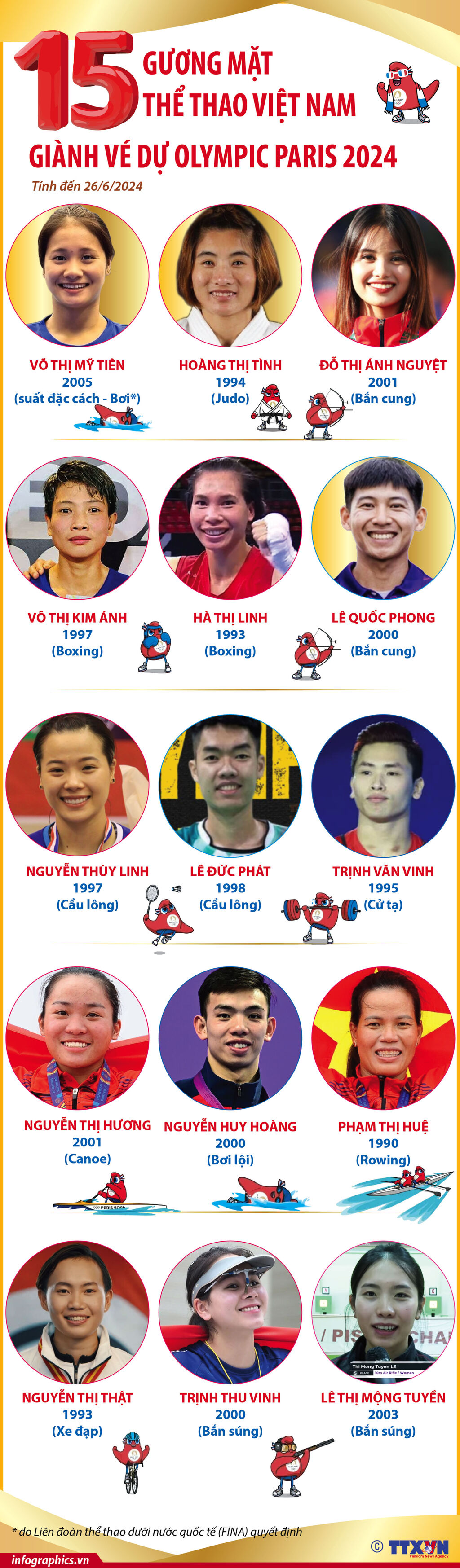 Hà Nội (TTXVN 26/6) Tính đến ngày 26/6/2024, thể thao Việt Nam có 15 vé chính thức tham dự Olympic Paris 2024. Đó là các vận động viên: Nguyễn Thị Thật (xe đạp), Nguyễn Huy Hoàng (bơi lội), Trịnh Thu Vinh và Lê Thị Mộng Tuyền (bắn súng), Trịnh Văn Vinh (cử tạ), Nguyễn Thị Hương (canoe), Phạm Thị Huệ (Rowing) Nguyễn Thùy Linh và Lê Đức Phát (cầu lông); Võ Thị Kim Ánh và Hà Thị Linh (boxing); Lê Quốc Phong và Đỗ Thị Ánh Nguyệt (bắn cung); Hoàng Thị Tình (judo) và Võ Thị Mỹ Tiên (suất đặc cách môn Bơi).