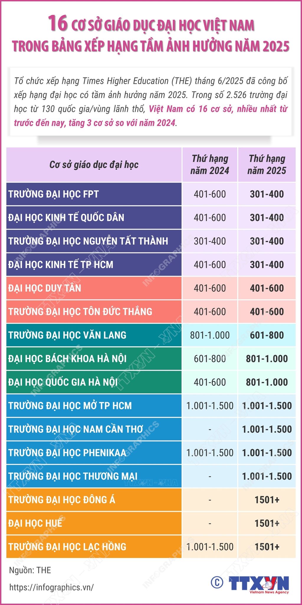 Tổ chức xếp hạng Times Higher Education (THE) vừa công bố xếp hạng đại học có tầm ảnh hưởng năm 2025. Trong số 2.526 trường đại học từ 130 quốc gia/vùng lãnh thổ, Việt Nam có 16 cơ sở, nhiều nhất từ trước đến nay, tăng 3 cơ sở so với năm 2024. Bốn cơ sở mới có mặt là trường đại học Nam Cần Thơ, Thương mại, Đông Á và Đại học Huế. Trường đại học Việt Đức năm ngoái cũng trong nhóm này, nhưng năm nay không được xếp hạng.