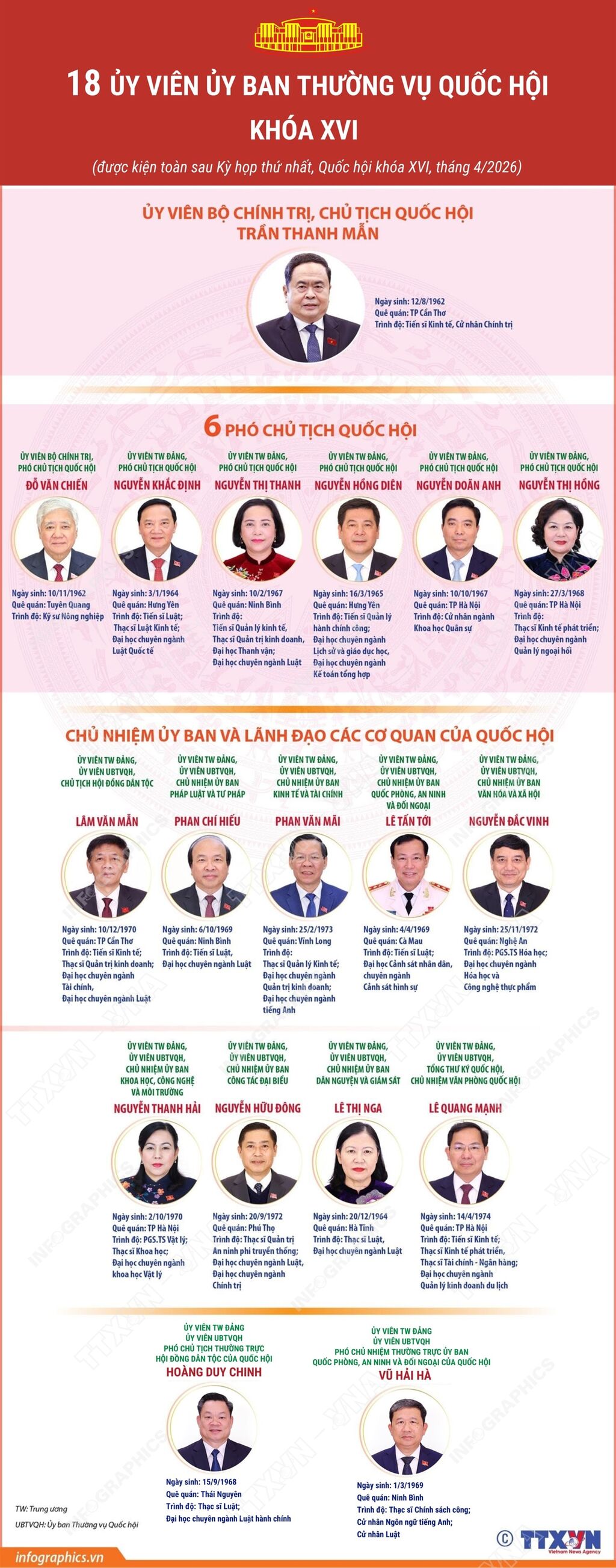 Ngày 6/4/2026, Quốc hội khóa XVI đã bầu Phó Chủ tịch Quốc hội và Ủy viên Ủy ban Thường vụ Quốc hội khóa XVI bằng hình thức bỏ phiếu kín. Quốc hội bầu các chức danh Chủ tịch Hội đồng Dân tộc, Chủ nhiệm Ủy ban của Quốc hội khóa XVI, Tổng Thư ký Quốc hội khóa XVI - Chủ nhiệm Văn phòng Quốc hội, Tổng Kiểm toán nhà nước nhiệm kỳ 2026 - 2031 bằng hình thức bỏ phiếu kín. Thông tấn xã Việt Nam trân trọng giới thiệu Lãnh đạo Quốc hội và các cơ quan của Quốc hội khóa XVI