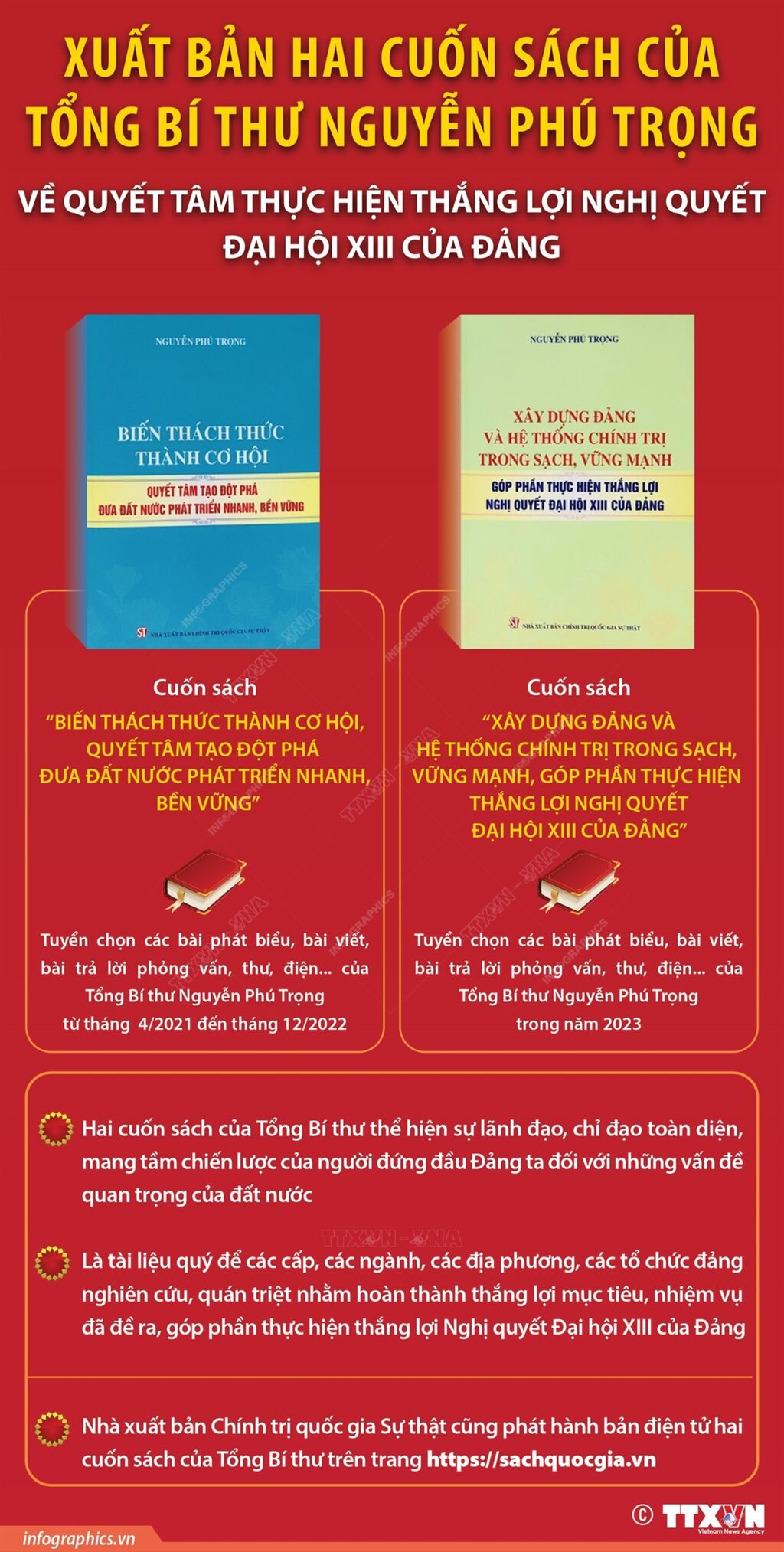 Ngày 2/2/2024, Nhà Xuất bản Chính trị quốc gia Sự thật cho biết vừa xuất bản hai cuốn sách của Tổng Bí thư Nguyễn Phú Trọng: “Biến thách thức thành cơ hội, quyết tâm tạo đột phá đưa đất nước phát triển nhanh, bền vững” và “Xây dựng Đảng và hệ thống chính trị trong sạch, vững mạnh, góp phần thực hiện thắng lợi Nghị quyết Đại hội XIII của Đảng”. Hai cuốn sách tuyển chọn các bài nói, bài viết, bài phát biểu, thư, điện… tiêu biểu của Tổng Bí thư Nguyễn Phú Trọng trong 3 năm (2021-2023) triển khai Nghị quyết Đại hội đại biểu toàn quốc lần thứ XIII của Đảng; thể hiện sự lãnh đạo, chỉ đạo toàn diện của Tổng Bí thư trên các lĩnh vực, với các ngành, các cấp, các địa phương. Việc xuất bản hai cuốn sách này là sự tiếp nối các cuốn sách của Tổng Bí thư Nguyễn Phú Trọng đã xuất bản trong nhiệm kỳ khóa XI và khóa XII của Đảng.