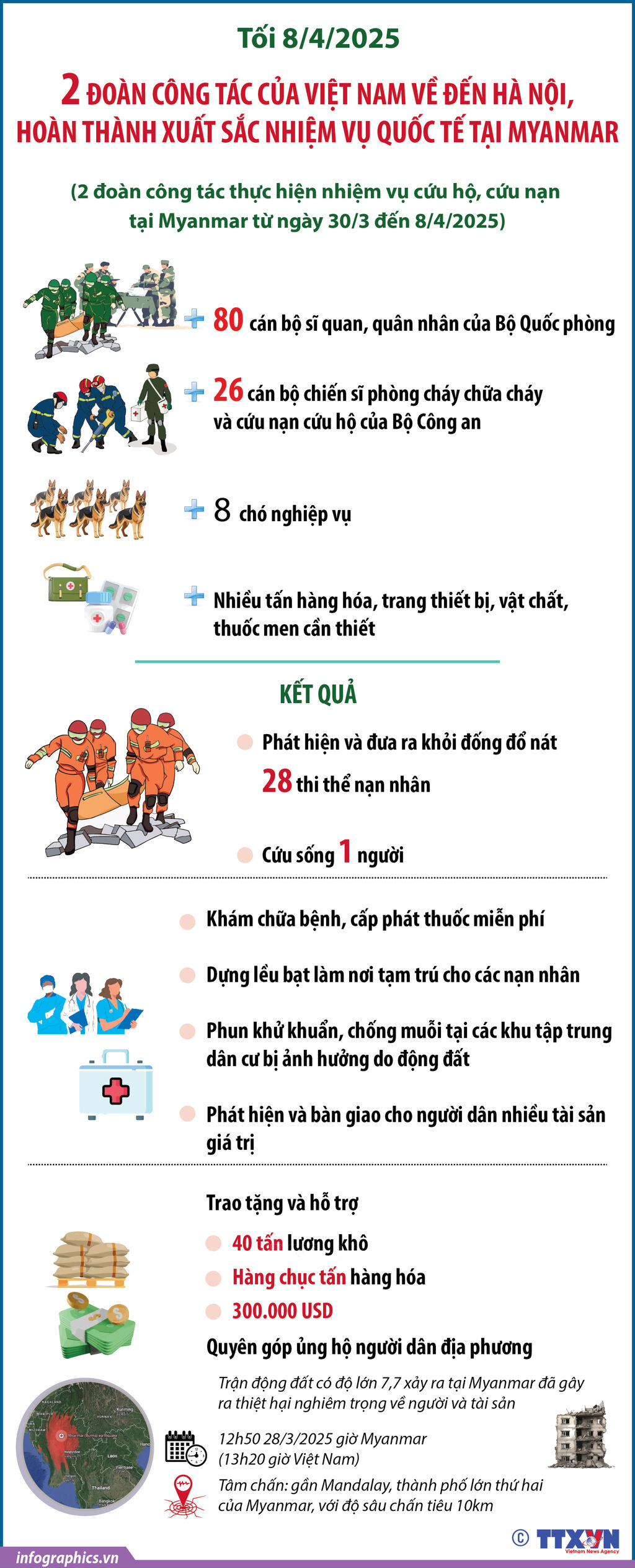 Tối 8/4/2025, hai đoàn công tác của Việt Nam tham gia hỗ trợ khắc phục hậu quả động đất tại Myanmar, gồm lực lượng của Quân đội nhân dân và Bộ Công an đã về đến Hà Nội, hoàn thành xuất sắc nhiệm vụ cứu hộ, cứu nạn tại Myanmar sau thảm họa động đất có độ lớn 7,7 xảy ra ngày 28/3/2025 tại quốc gia này.