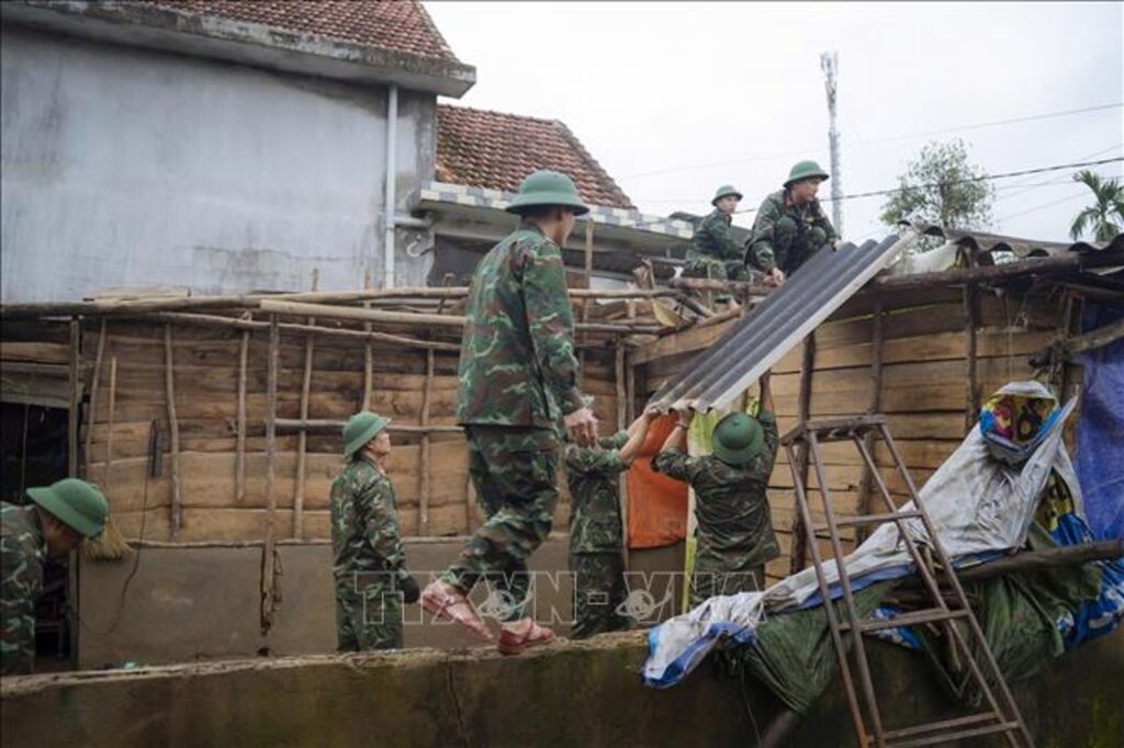| Lực lượng bộ đội ra quân giúp dân xây dựng và sửa chữa nhà cửa bị ảnh hưởng bởi mưa lũ tại xã Lộc An, thành phố Huế. |