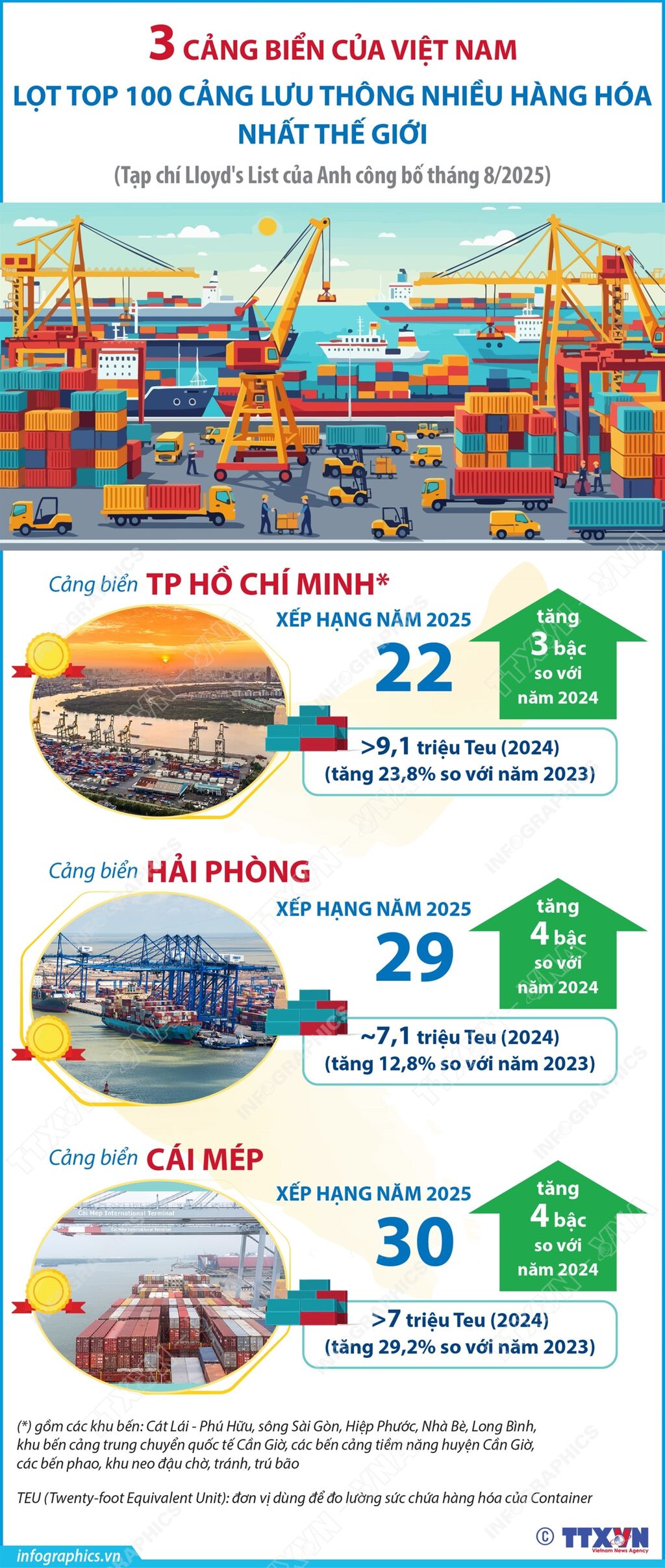 Tạp chí Lloyd's List của Vương quốc Anh vừa công bố bảng xếp hạng 100 cảng container năm 2025 có lưu lượng hàng hóa qua cảng lớn nhất thế giới. Đáng chú ý, Việt Nam có 3 cảng biển lọt trong danh sách này là Cảng biển Thành phố Hồ Chí Minh, Cảng biển Hải Phòng và Cảng biển Cái Mép.