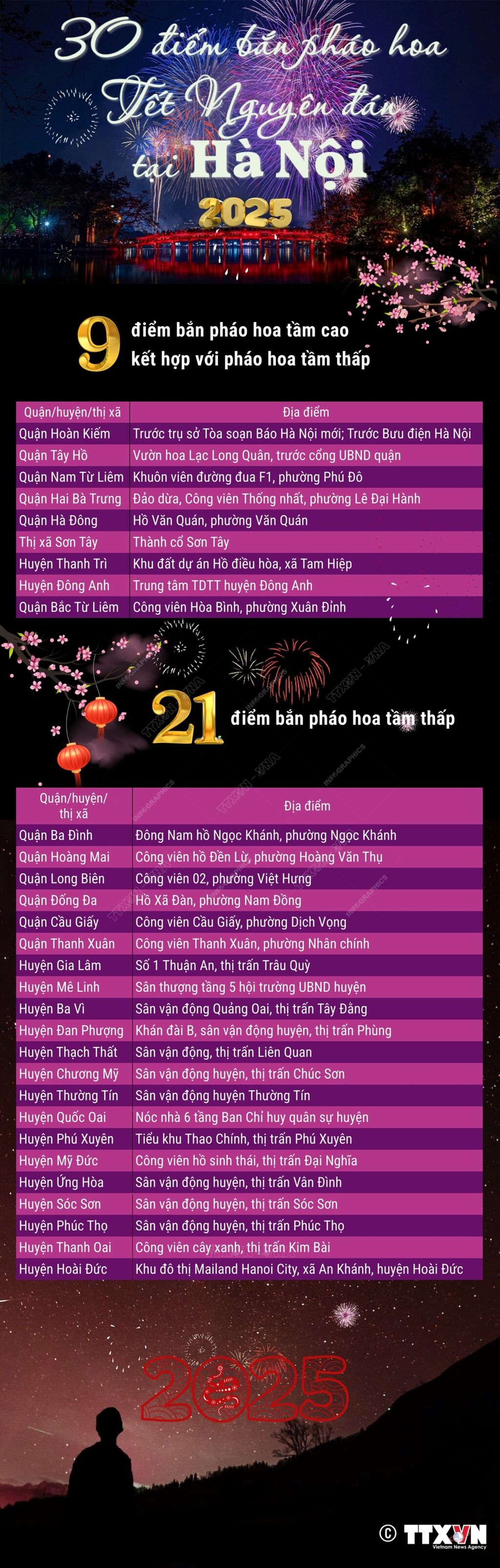Dịp Tết Nguyên đán Ất Tỵ 2025, Hà Nội tổ chức 30 điểm bắn pháo hoa với 31 trận địa, trong đó có 10 trận địa (tại 9 điểm) bắn pháo hoa tầm cao kết hợp pháo hoa tầm thấp và 21 trận địa (tại 21 điểm) bắn pháo hoa tầm thấp.