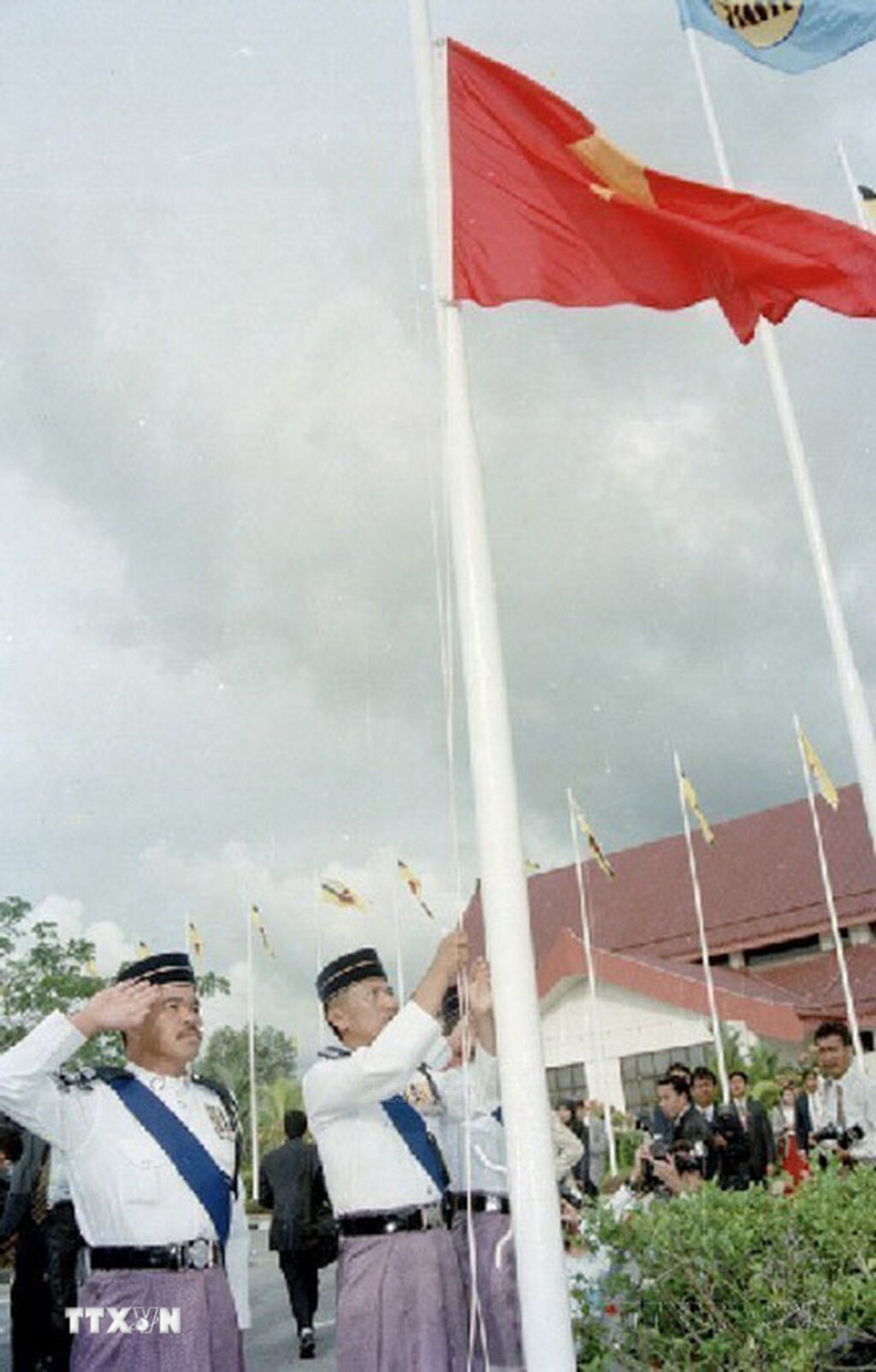 | Nghi thức thượng cờ tại Lễ kết nạp Việt Nam là thành viên chính thức thứ bảy của Hiệp hội các Quốc gia Đông Nam Á (ASEAN), chiều 28/7/1995, tại Thủ đô Bandar Seri Begawan (Brunei). (Ảnh: Trần Sơn/TTXVN) |