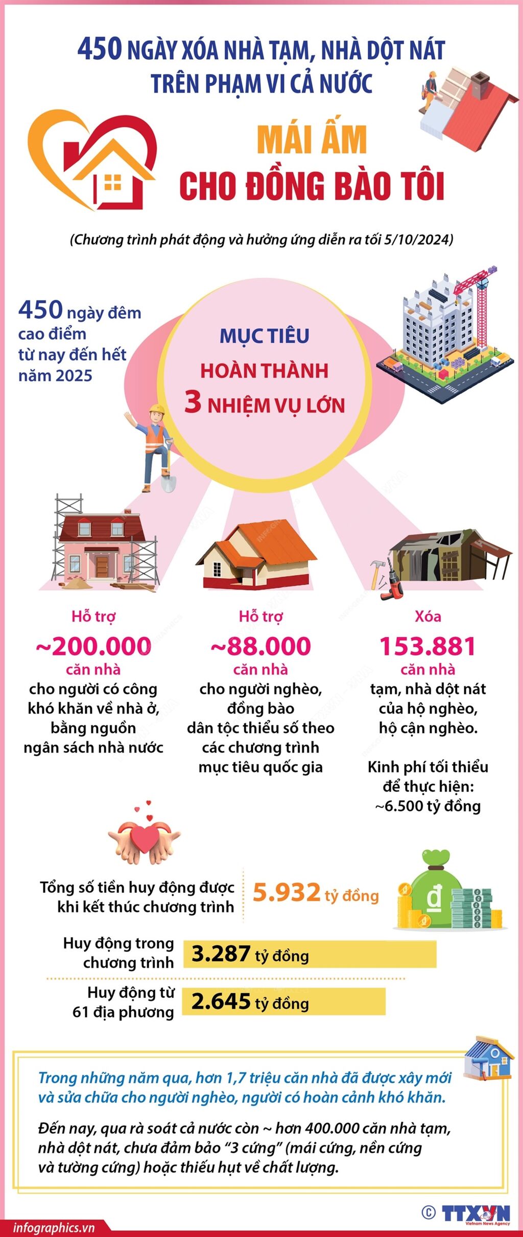 Phong trào thi đua “Chung tay xóa nhà tạm, nhà dột nát trên phạm vi cả nước trong năm 2025” hướng đến mục tiêu sẽ xóa bỏ hoàn toàn nhà tạm, nhà dột nát cho hộ nghèo, hộ cận nghèo, người dân bị ảnh hưởng bởi thiên tai, biến đổi khí hậu và hỗ trợ gia đình người có công gặp khó khăn về nhà ở, nhà xuống cấp cần được sửa chữa, xây mới trên địa bàn cả nước, góp phần thực hiện có hiệu quả mục tiêu giảm tỷ lệ hộ nghèo đa chiều; tạo tiền đề để tập trung thu hút đầu tư, phát triển kinh tế, thực hiện thắng lợi các mục tiêu, chỉ tiêu Nghị quyết Đại hội đại biểu toàn quốc lần thứ XIII của Đảng. Từ nay tới hết năm 2025, số nhà còn lại cần hỗ trợ xây mới, sửa chữa là 153.881 căn, trong đó 106.967 nhà xây mới, 46.914 nhà sửa chữa.