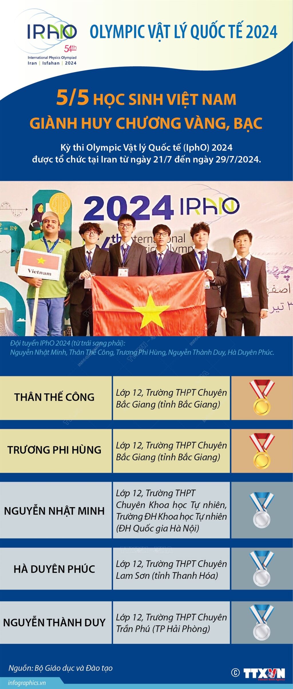 5/5 học sinh Việt Nam dự thi Olympic Vật lý quốc tế (IPhO) năm 2024 (tổ chức tại Iran từ ngày 21/7 đến ngày 29/7/2024) đều đoạt huy chương, gồm: 2 Huy chương Vàng và 3 Huy chương Bạc. Với thành tích 100% học sinh đoạt huy chương, đoàn Việt Nam nằm trong nhóm các nước có kết quả cao nhất tại kỳ thi năm nay.