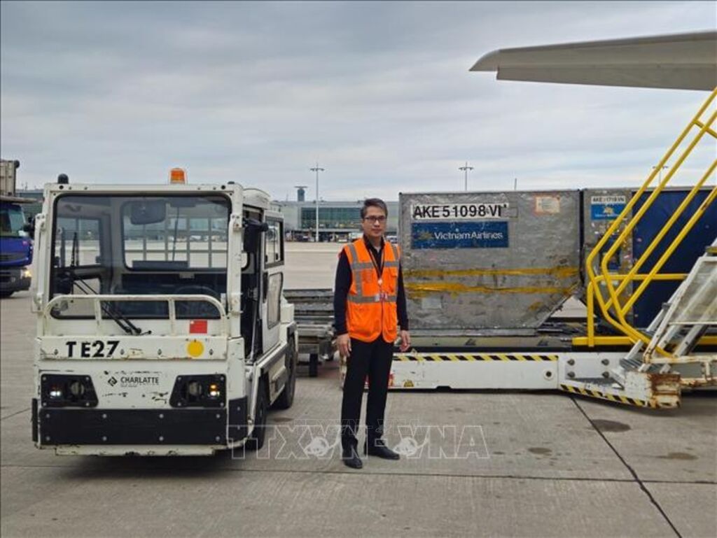 | Ông Vũ Anh Sơn, Trưởng Thương vụ Việt Nam tại Pháp, phối hợp với doanh nghiệp đón nhận lô vải thiều đầu tiên của mùa vụ 2025 cập cảng hàng không Paris CDG. Ảnh: TTXVN phát |