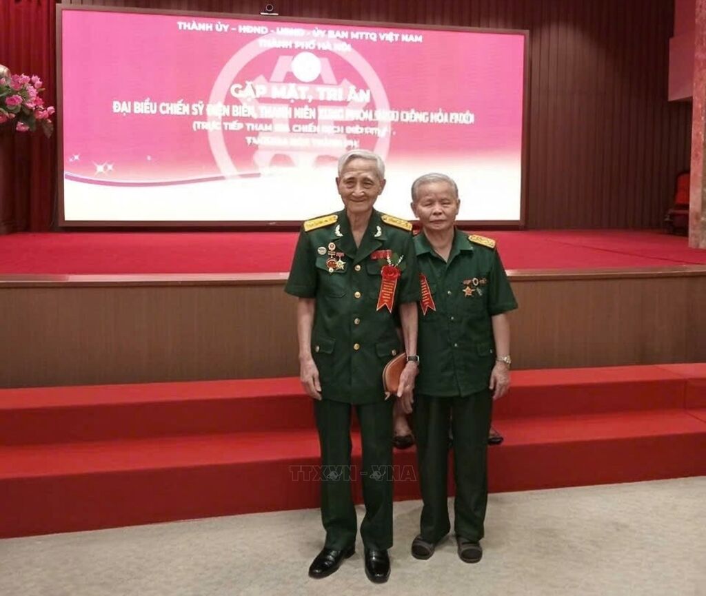 | Ông Phạm Thịnh (bên trái) cùng đồng đội trong cuộc gặp mặt kỷ niệm 70 năm chiến thắng Điện Biên Phủ. Ảnh: Bnews/vnanet.vn phát |