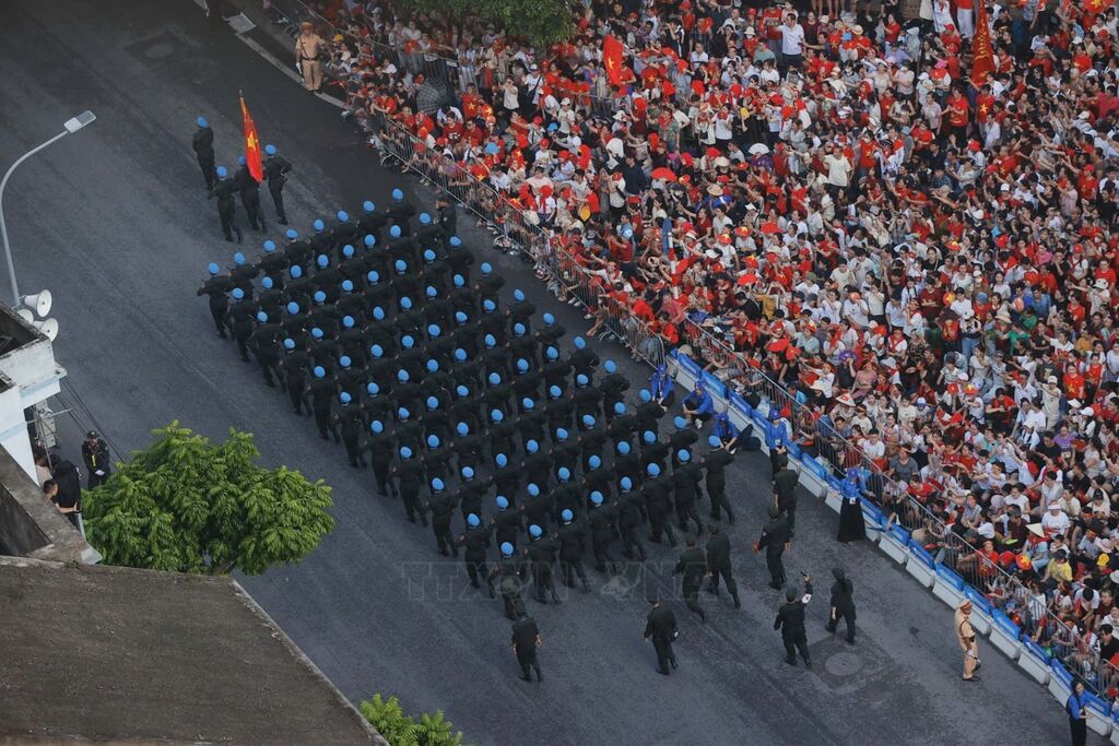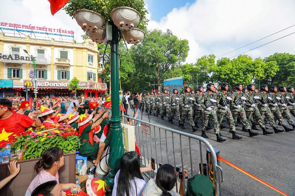 | Khối lực lượng vũ trang diễu hành trên đường phố Hà Nội. |