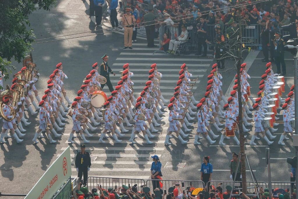 | Khối nữ Quân nhạc diễu hành trên đường phố Hà Nội. |