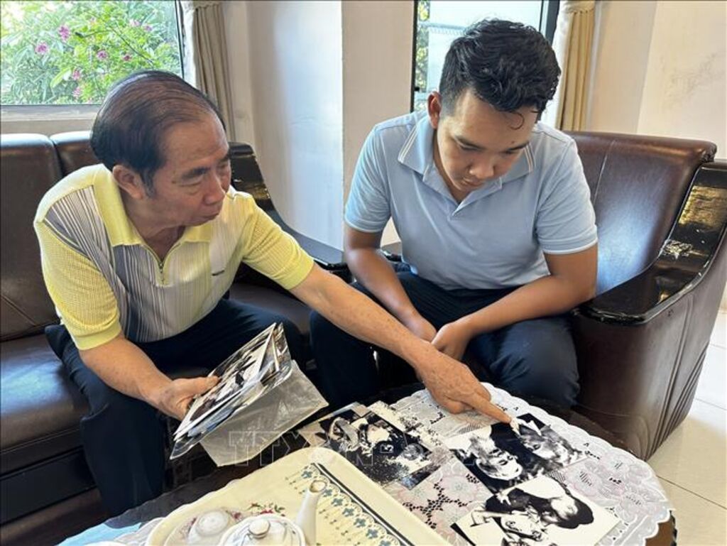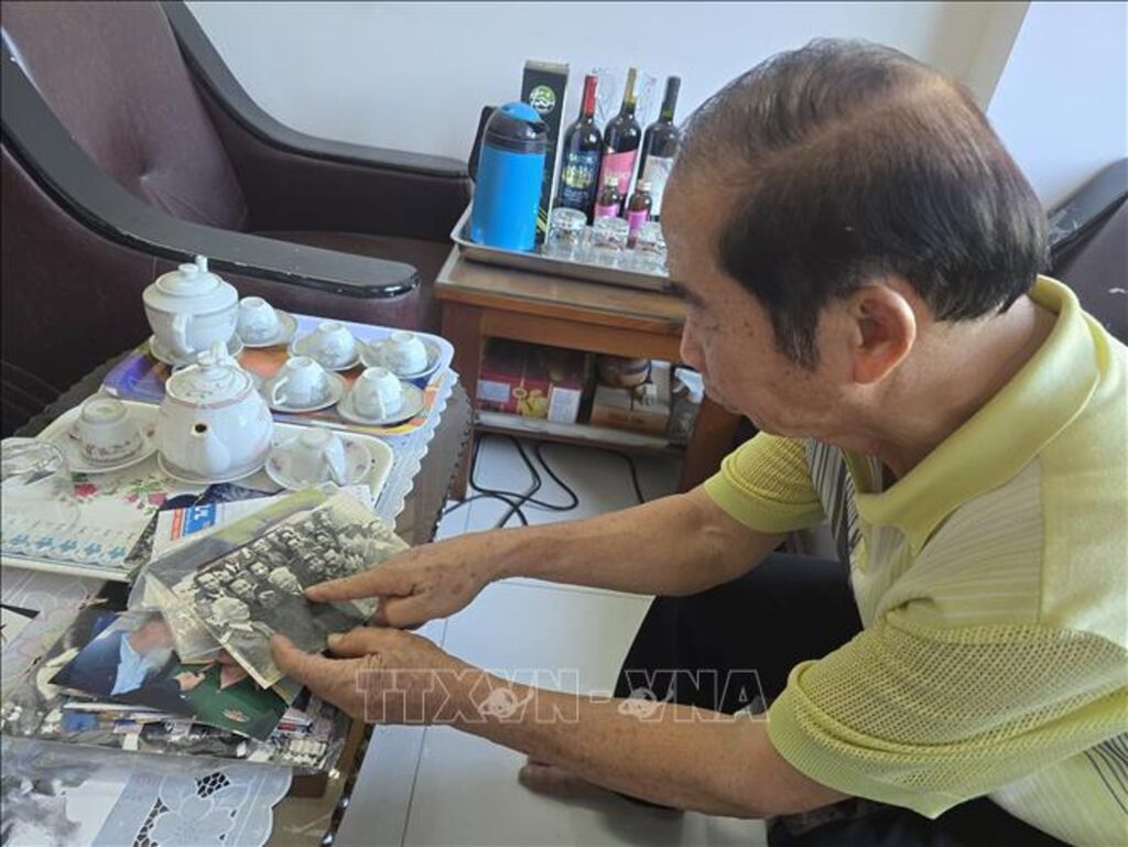 | Nhà báo Trần Xuân Quang chia sẻ với phóng viên trẻ của TTXVN về những tấm ảnh quý mà ông đã chụp trong quá trình làm báo. |