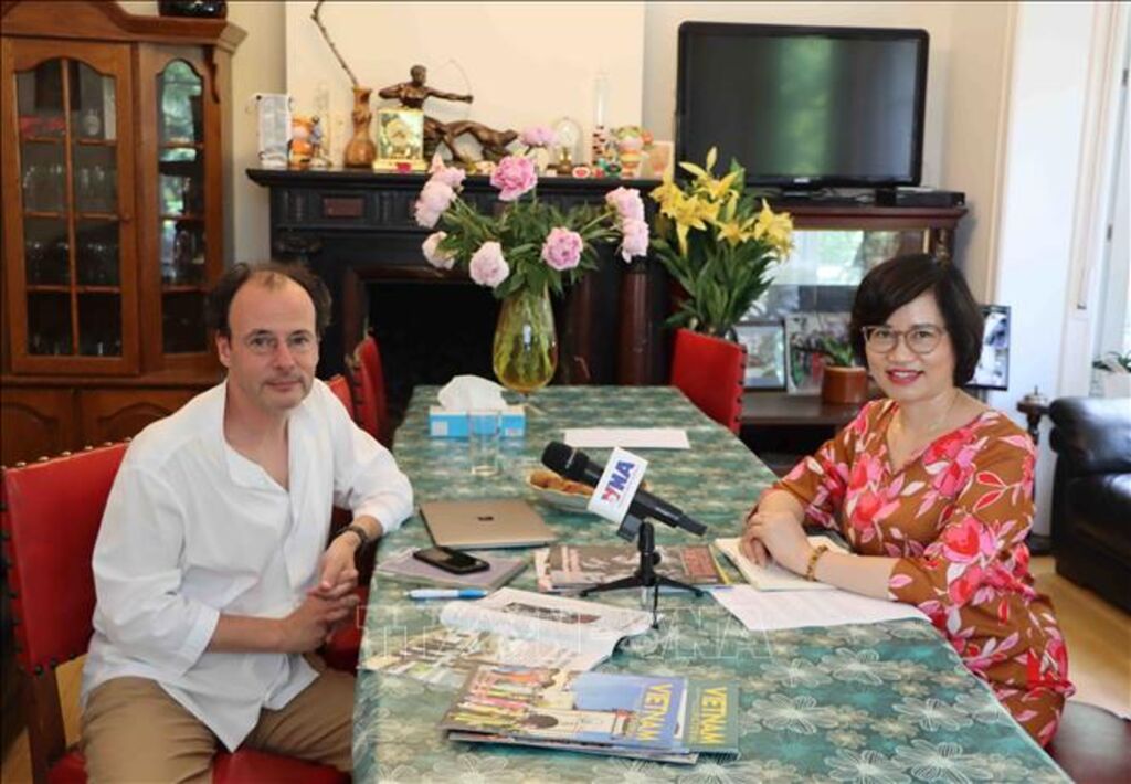 | Ông David Grunewald, giảng viên Đại học Tự do Brussels (ULB), trả lời phỏng vấn phóng viên TTXVN tại Brussels. Ảnh: Duy Tùng - PV TTXVN tại Bỉ |