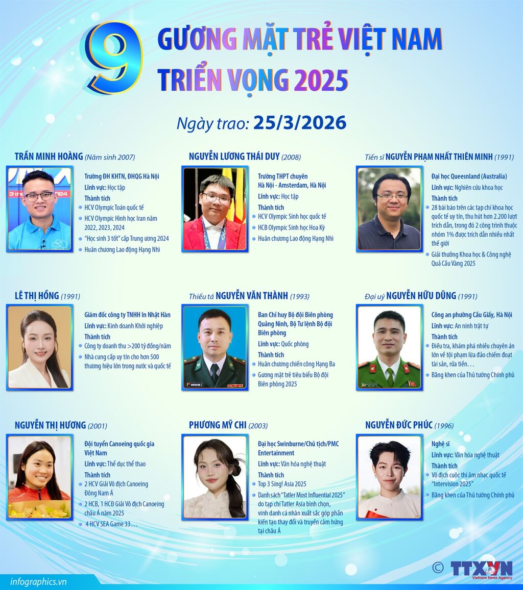 Tối 25/3/2026, tại Thủ đô Hà Nội, Trung ương Đoàn TNCS Hồ Chí Minh, Quỹ Hỗ trợ Tài năng trẻ Việt Nam tổ chức Lễ trao Giải thưởng Gương mặt trẻ Việt Nam tiêu biểu năm 2025. Danh sách 9 gương mặt trẻ Việt Nam triển vọng năm 2025 gồm: Trần Minh Hoàng, lĩnh vực học tập; Nguyễn Lương Thái Duy, lĩnh vực học tập; Nguyễn Phạm Nhất Thiên Minh, lĩnh vực nghiên cứu khoa học; Lê Thị Hồng, lĩnh vực kinh doanh – khởi nghiệp; Nguyễn Văn Thành, lĩnh vực quốc phòng; Nguyễn Hữu Dũng, lĩnh vực an ninh trật tự; Nguyễn Thị Hương, lĩnh vực thể dục thể thao; Phương Mỹ Chi, lĩnh vực văn hóa nghệ thuật; Nguyễn Đức Phúc, lĩnh vực văn hóa nghệ thuật.