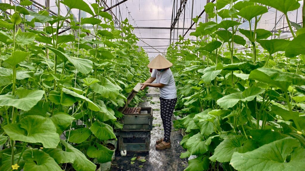 Vườn dưa lưới cho năng suất cao nhờ hệ thống tưới nhỏ giọt tự động, điều khiển qua điện thoại thông minh. Ảnh: Thanh Sang-TTXVNChị Huỳnh Ngọc Diện, ấp Mỹ An 2, xã Mỹ Hòa Hưng, tỉnh An Giang, canh tác 3-4 vụ dưa lưới một năm, mỗi vụ cho năng suất 2-3 tấn, bán ra với giá từ 40.000 – 60.000 đồng/kg, tùy thời điểm. Ảnh: Thanh Sang-TTXVNChị Huỳnh Ngọc Diện, ấp Mỹ An 2, xã Mỹ Hòa Hưng (An Giang) chăm sóc dưa lưới được trồng trong nhà kính ứng dụng công nghệ cao. Ảnh: Thanh Sang-TTXVNĐể đảm bảo quá trình thụ phấn cho hoa dưa, chị Diện nuôi ong mật trong nhà lưới, mang lại môi trường sinh thái tự nhiên cho cây trồng. Ảnh: Thanh Sang-TTXVNNhững trái dưa lưới vàng đẹp, đạt chuẩn đầu ra cho các chuỗi cửa hàng nông sản sạch. Ảnh: Thanh Sang-TTXVN