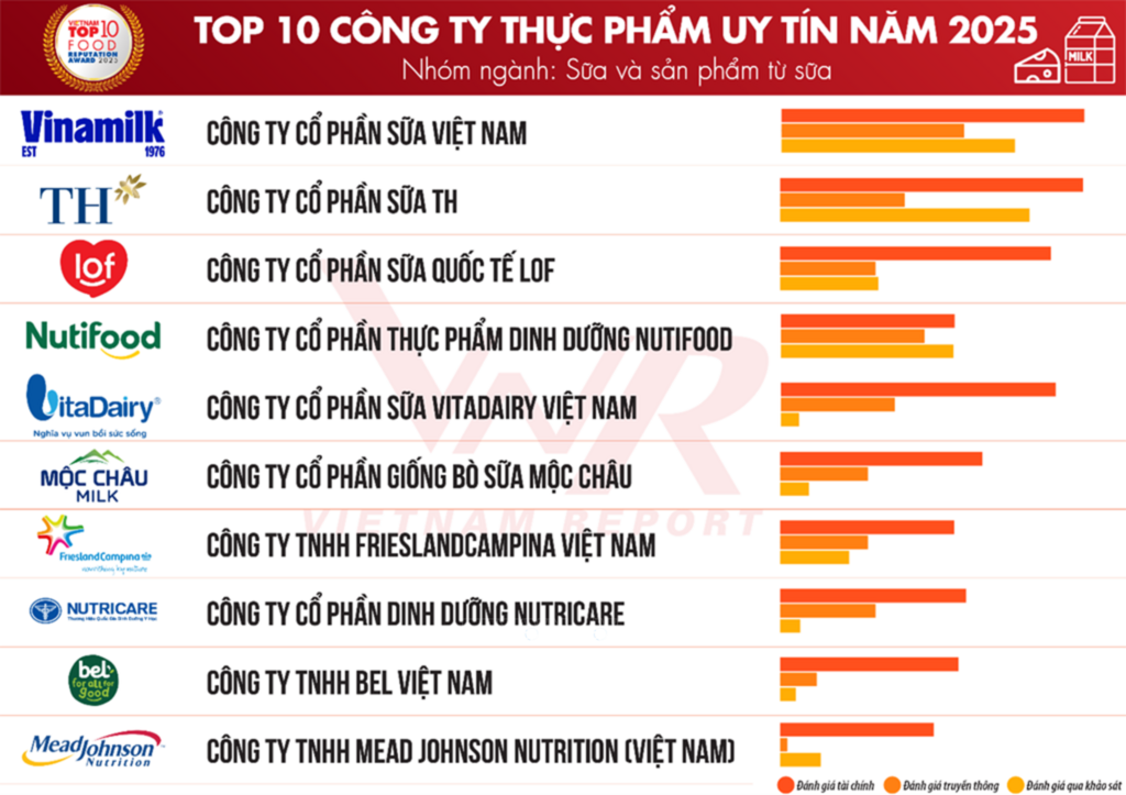 Ông Vũ Đăng Vinh cho biết thêm, tháng 10/2025, tại Hà Nội, Vietnam Report sẽ tổ chức Lễ tôn vinh các doanh nghiệp tiêu biểu và Top 10 Công ty uy tín ngành Thực phẩm - Đồ uống năm 2025. Theo đó, đứng dầu danh sách là Công ty cổ phần Sữa Việt Nam, Công ty cổ phần Sữa TH, Công ty cổ phần Sữa quốc tế LOF, Công ty cổ phần thực phẩm dinh dưỡng Nutifood, Công ty cổ phần Sữa Vitadairy Việt Nam, Công ty cổ phần Giống bò sữa Mộc Châu, Công ty TNHH Frieslandcampina Việt Nam, Công ty cổ phần dinh dưỡng Nutricare, Công ty TNHH BEL Việt Nam, Công ty TNHH Mead Johnson Nutrition (Việt Nam).