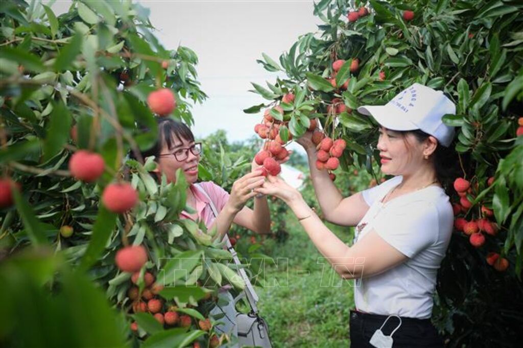 | Khách du lịch tham quan và chụp ảnh lưu niệm vào mùa vải tại Lục Ngạn (Bắc Giang). |