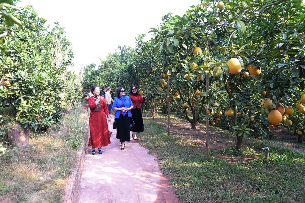 | Du khách tham quan vườn bưởi của gia đình ông Nguyễn Văn Hữu ở phường Chũ (Bắc Ninh) |