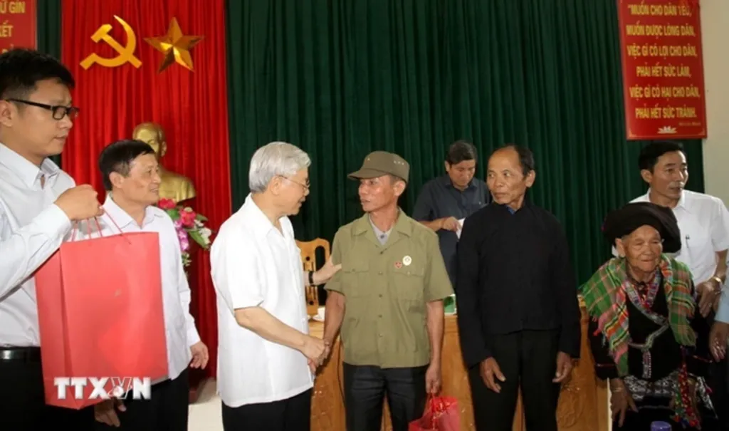 | Tổng Bí thư Nguyễn Phú Trọng trò chuyện, động viên đồng bào các dân tộc tại xã Bản Bo, huyện Tam Đường vào tháng 7/2016. |