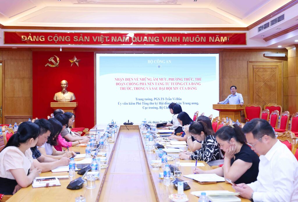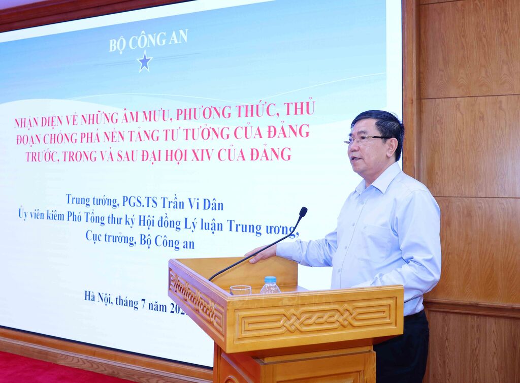 | Trung tướng, PGS.TS Trần Vi Dân, Phó Tổng Thư ký Hội đồng Lý luận Trung ương, Cục trưởng Cục Khoa học, Chiến lược và Lịch sử Công an (Bộ Công an) giới thiệu chuyên đề tại Hội nghị. |