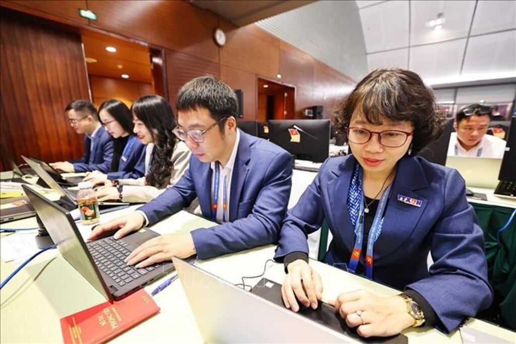 | Nhóm phóng viên Ban biên tập tin Trong nước (TTXVN) tác nghiệp tại Trung tâm báo chí của Đại hội XIV của Đảng. |