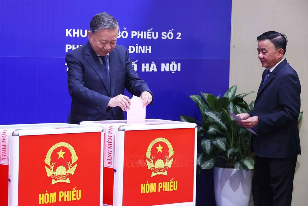 | Tổng Bí thư Tô Lâm và đồng chí Trần Cẩm Tú, Ủy viên Bộ Chính trị, Thường trực Ban Bí thư bỏ phiếu bầu cử tại Khu vực bỏ phiếu số 02 phường Ba Đình, thành phố Hà Nội. |