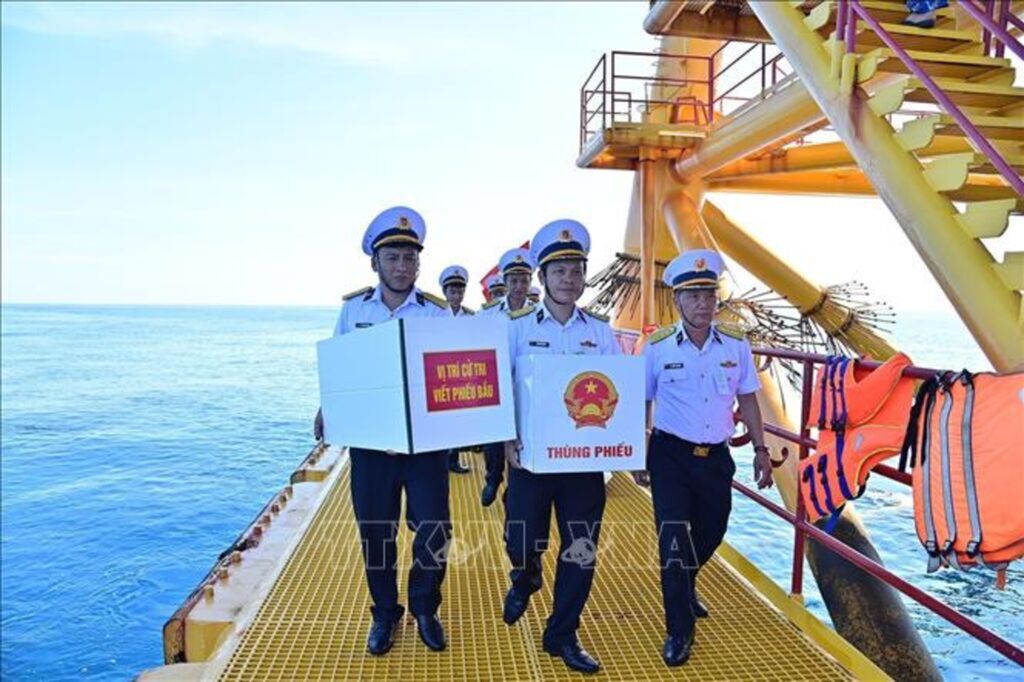 | Tổ bầu cử mang thùng phiếu và vật tư trang lên nhà giàn DK1/9 |