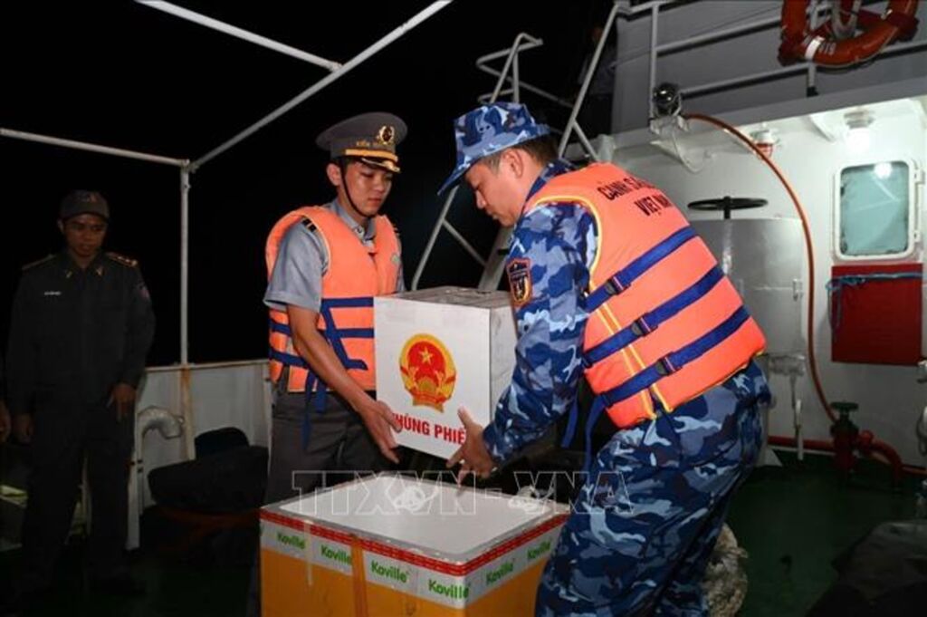 | Đưa hòm phiếu vào thùng xốp để bảo quản khi Tổ bầu cử di chuyển từ tàu Kiểm ngư 260 sang tàu Cảnh sát biển 6008. |