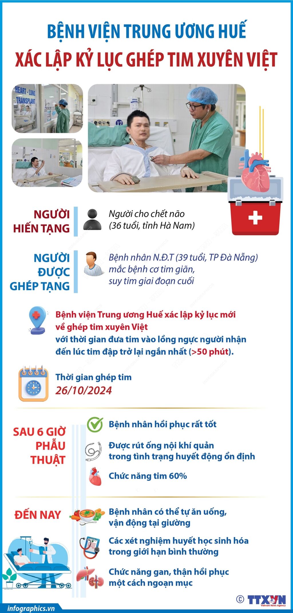 Ngày 30/10/2024, Bệnh viện Trung ương Huế (Thừa Thiên Huế) vừa thực hiện thành công ca ghép tim thứ 13, mang lại sự sống cho một bệnh nhân nam suy tim giai đoạn cuối. Qua đó, bệnh viện xác lập kỷ lục mới về ghép tim xuyên Việt với thời gian đưa tim vào lồng ngực người nhận đến lúc tim đập trở lại ngắn nhất (>50 phút).