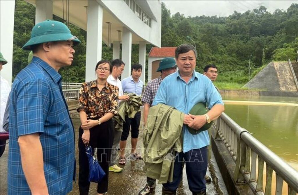 | Bí thư Tỉnh ủy Bắc Kạn Hoàng Duy Chinh (bên trái, áo xanh thẫm) kiểm tra công tác ứng phó với bão, lũ tại hồ chứa nước Nậm Cắt (xã Dương Quang, thành phố Bắc Kạn). |