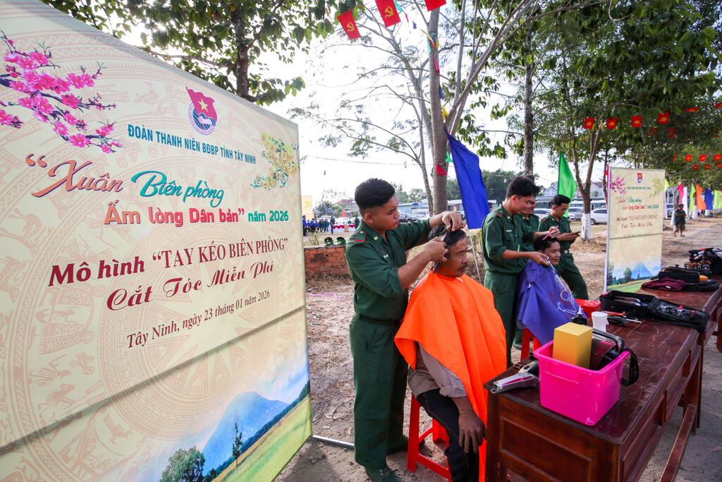 | Bộ đội Biên phòng Tây Ninh cắt tóc miễn phí cho người dân. |