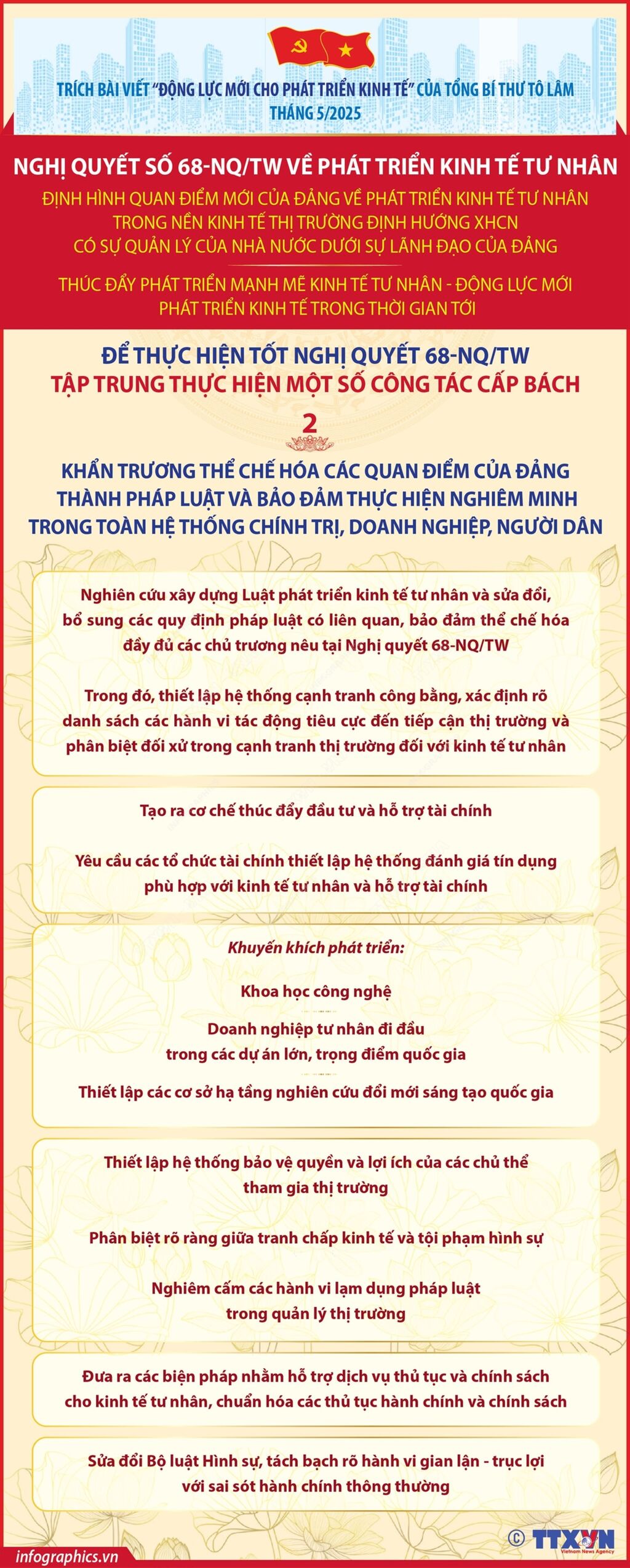 Trong bài viết “Động lực mới cho phát triển kinh tế”, Tổng Bí thư Tô Lâm chỉ rõ: Ngày 4/5/2025, Bộ Chính trị ban hành Nghị quyết số 68-NQ/TW về phát triển kinh tế tư nhân, với các mục tiêu, quan điểm, nhiệm vụ, giải pháp đột phá, chưa từng có tiền lệ; định hình quan điểm mới của Đảng về phát triển kinh tế tư nhân trong nền kinh tế thị trường định hướng xã hội chủ nghĩa có sự quản lý của Nhà nước dưới sự lãnh đạo của Đảng; thúc đẩy phát triển mạnh mẽ kinh tế tư nhân - động lực mới phát triển kinh tế trong thời gian tới. Theo Tổng Bí thư Tô Lâm, để thực hiện thắng lợi Nghị quyết số 68, cần tập trung thực hiện một số công tác cấp bách sau đây: Thứ nhất, triển khai quyết liệt, hiệu quả các công tác sớm đưa Nghị quyết của Đảng vào thực tiễn cuộc sống. Thứ hai, khẩn trương thể chế hoá các quan điểm của Đảng thành pháp luật và bảo đảm thực hiện nghiêm minh trong toàn hệ thống chính trị, doanh nghiệp, người dân. Thứ ba, đặc biệt quan tâm hỗ trợ doanh nghiệp nhỏ, siêu nhỏ, thúc đẩy phát triển xã hội có tư tưởng khởi nghiệp, khát vọng làm chủ, đặc biệt trong lĩnh vực đổi mới sáng tạo. Thứ tư, xây dựng đội ngũ doanh nhân thật sự trở thành “chiến sỹ” trên mặt trận kinh tế, tham gia thực chất trong hoạch định chính sách.