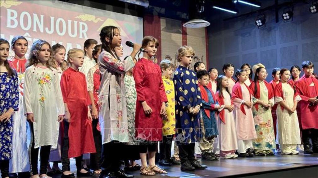 | Tiết mục "Bonjour Vietnam" do thiếu nhi Việt Nam và Pháp thể hiện. Ảnh: Thu Hà - PV TTXVN tại Pháp |