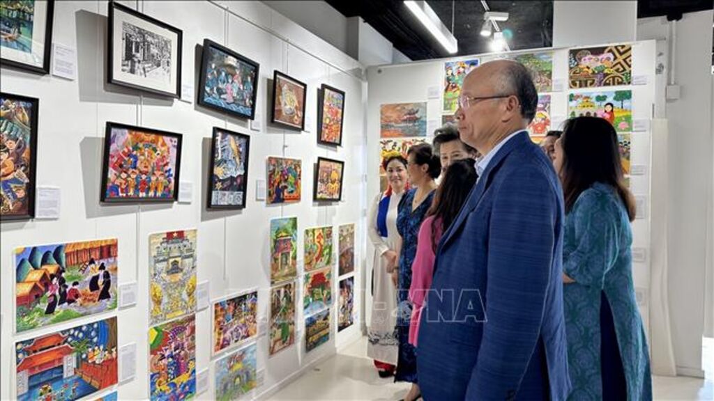 | Khách tham quan triển lãm trưng bày các tác phẩm tranh của thiếu nhi Việt Nam sống tại 17 quốc gia trên thế giới. Ảnh: Thu Hà - PV TTXVN tại Pháp |