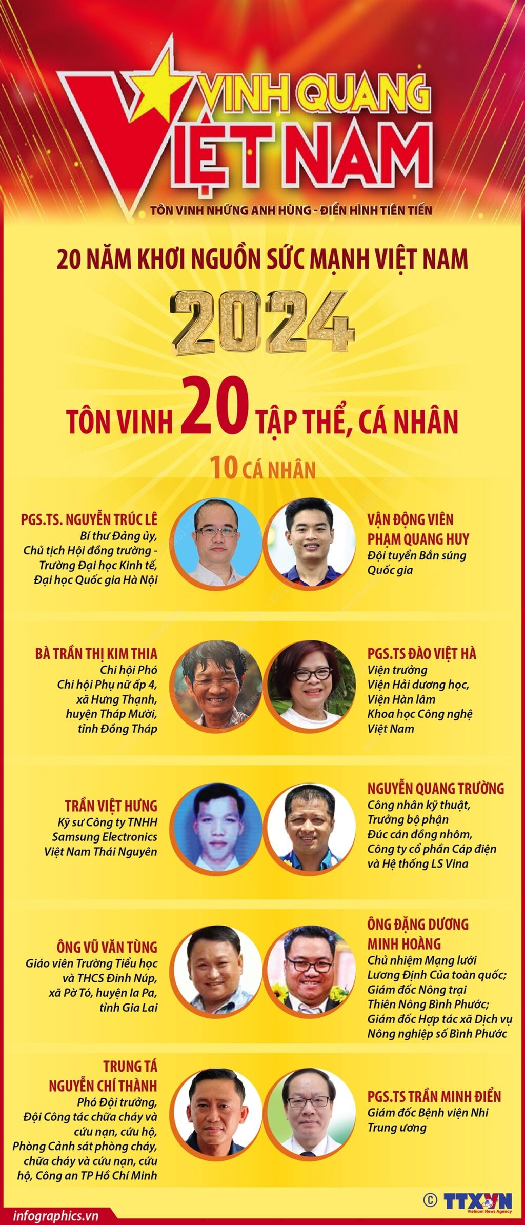 Chiều 19/5/2024, Chương trình Vinh quang Việt Nam năm 2024 với chủ đề "20 năm khơi nguồn sức mạnh Việt Nam" diễn ra tại Nhà hát Lớn TP Hà Nội. Chương trình vinh danh 20 tập thể, cá nhân xuất sắc, tiêu biểu trong mọi lĩnh vực của đời sống xã hội; đồng thời cũng nhìn lại 20 năm kể từ lần đầu tiên Chương trình được tổ chức (tháng 5/2004).