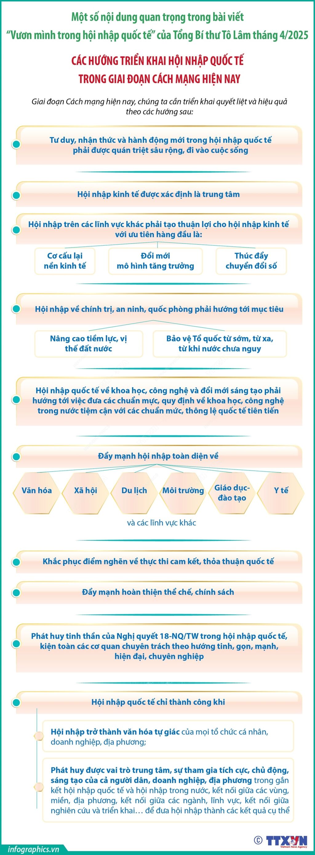 Trong bài viết “Vươn mình trong hội nhập quốc tế” ngày 3/4/2025, Tổng Bí thư Tô Lâm khẳng định: Trong 40 năm đổi mới, tiến trình hội nhập quốc tế của Việt Nam đã đạt những kết quả quan trọng, mang tầm vóc lịch sử. Từ một đất nước bị bao vây cô lập, Việt Nam đã thiết lập quan hệ ngoại giao với 194 quốc gia trên thế giới, có quan hệ Đối tác chiến lược và Đối tác toàn diện với 34 nước, trong đó có tất cả các thành viên thường trực Hội đồng bảo an Liên hợp quốc, các nước lớn; là thành viên tích cực của trên 70 tổ chức khu vực và quốc tế, có quan hệ chính trị, quốc phòng, an ninh phát triển sâu rộng, thực chất. Từ một nền kinh tế nghèo nàn, lạc hậu, trình độ thấp, bị bao vây, cấm vận, Việt Nam đã trở thành một trong 34 nền kinh tế lớn nhất thế giới, quy mô kinh tế tăng gần 100 lần so với năm 1986, thu nhập bình quân đầu người tăng từ dưới 100 USD lên gần 5.000 USD. Việt Nam lọt vào nhóm 20 nước có quy mô thương mại lớn nhất thế giới; nằm trong nhóm 20 nền kinh tế thu hút nhiều vốn đầu tư nước ngoài nhất thế giới từ năm 2019 đến nay, là một trong 10 quốc gia có lượng kiều hối lớn nhất thế giới.