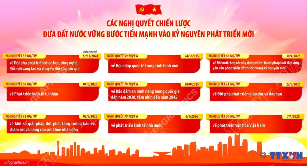 Từ tháng 12/2024 đến nay, Bộ Chính trị ban hành liên tiếp 9 nghị quyết chiến lược, tập trung vào các lĩnh vực then chốt của phát triển đất nước, gồm: Nghị quyết số 57-NQ/TW về Đột phá phát triển khoa học, công nghệ, đổi mới sáng tạo và chuyển đổi số quốc gia; Nghị quyết số 59-NQ/TW về Hội nhập quốc tế trong tình hình mới; Nghị quyết số 66-NQ/TW về Đổi mới công tác xây dựng và thi hành pháp luật đáp ứng yêu cầu phát triển đất nước trong kỷ nguyên mới; Nghị quyết số 68-NQ/TW về Phát triển kinh tế tư nhân; Nghị quyết số 70-NQ/TW về Bảo đảm an ninh năng lượng quốc gia đến năm 2030, tầm nhìn đến năm 2045; Nghị quyết số 71-NQ/TW về Đột phá phát triển giáo dục và đào tạo; Nghị quyết số 72-NQ/TW về Một số giải pháp đột phá, tăng cường bảo vệ, chăm sóc và nâng cao sức khỏe nhân dân; Nghị quyết 79-NQ/TW về phát triển kinh tế nhà nước; Nghị quyết số 80-NQ/TW về phát triển văn hoá Việt Nam.