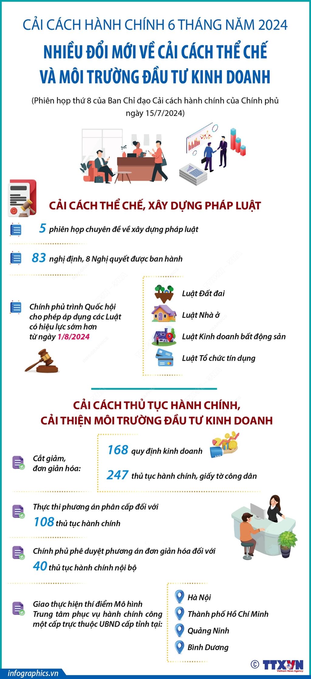 6 tháng năm 2024, công tác cải cách thể chế, cải cách thủ tục hành chính tiếp tục được đẩy mạnh. Về cải cách thể chế, xây dựng pháp luật, trong 6 tháng năm 2024, Chính phủ đã tổ chức 5 phiên họp chuyên đề về xây dựng pháp luật; ban hành 83 nghị định, 8 Nghị quyết; trình Quốc hội cho phép áp dụng các Luật: Đất đai, Nhà ở, Kinh doanh bất động sản và Tổ chức tín dụng có hiệu lực sớm hơn từ ngày 1/8/2024. Cải cách thủ tục hành chính, cải thiện môi trường đầu tư kinh doanh được đẩy mạnh; trong đó, đã cắt giảm, đơn giản hóa 168 quy định kinh doanh, 247 thủ tục hành chính, giấy tờ công dân, thực thi phương án phân cấp đối với 108 thủ tục hành chính…